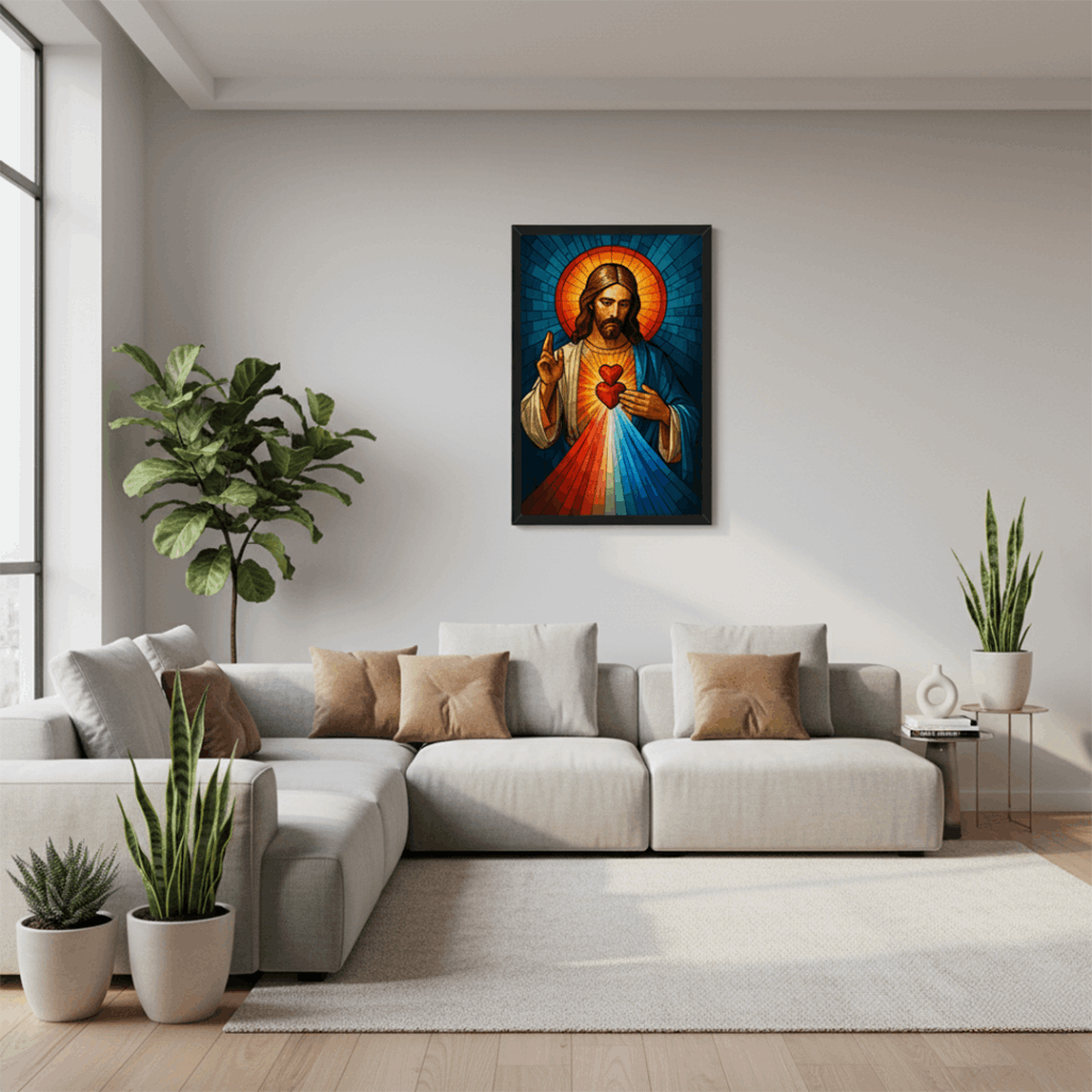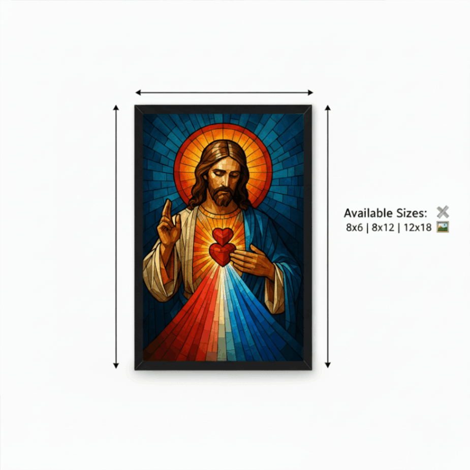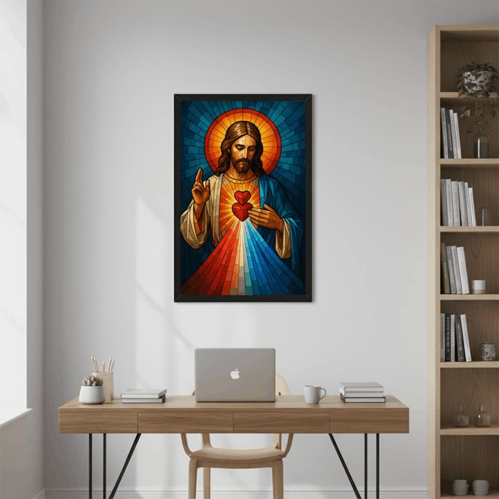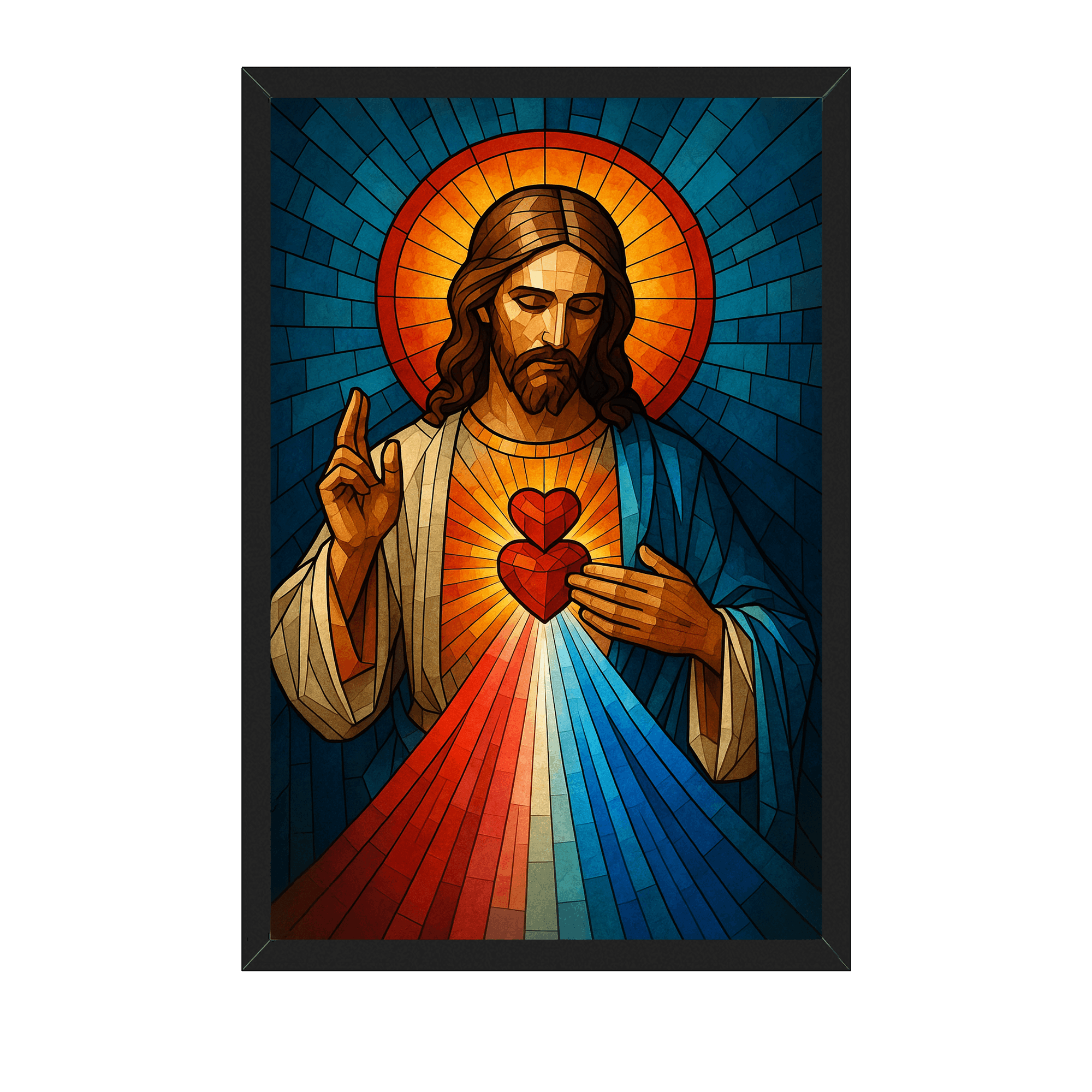 This stunning framed artwork depicts the Divine Mercy of Jesus in a radiant stained-glass style. The design features vivid blue, red, and golden hues symbolizing grace, forgiveness, and divine love. The intricate detailing and luminous color palette bring a sacred elegance that enhances any spiritual or home setting. Printed on premium-quality material and encased in a sleek black frame, this piece beautifully captures both artistry and devotion.