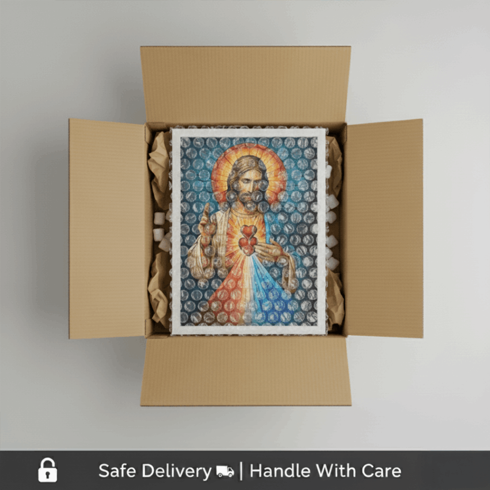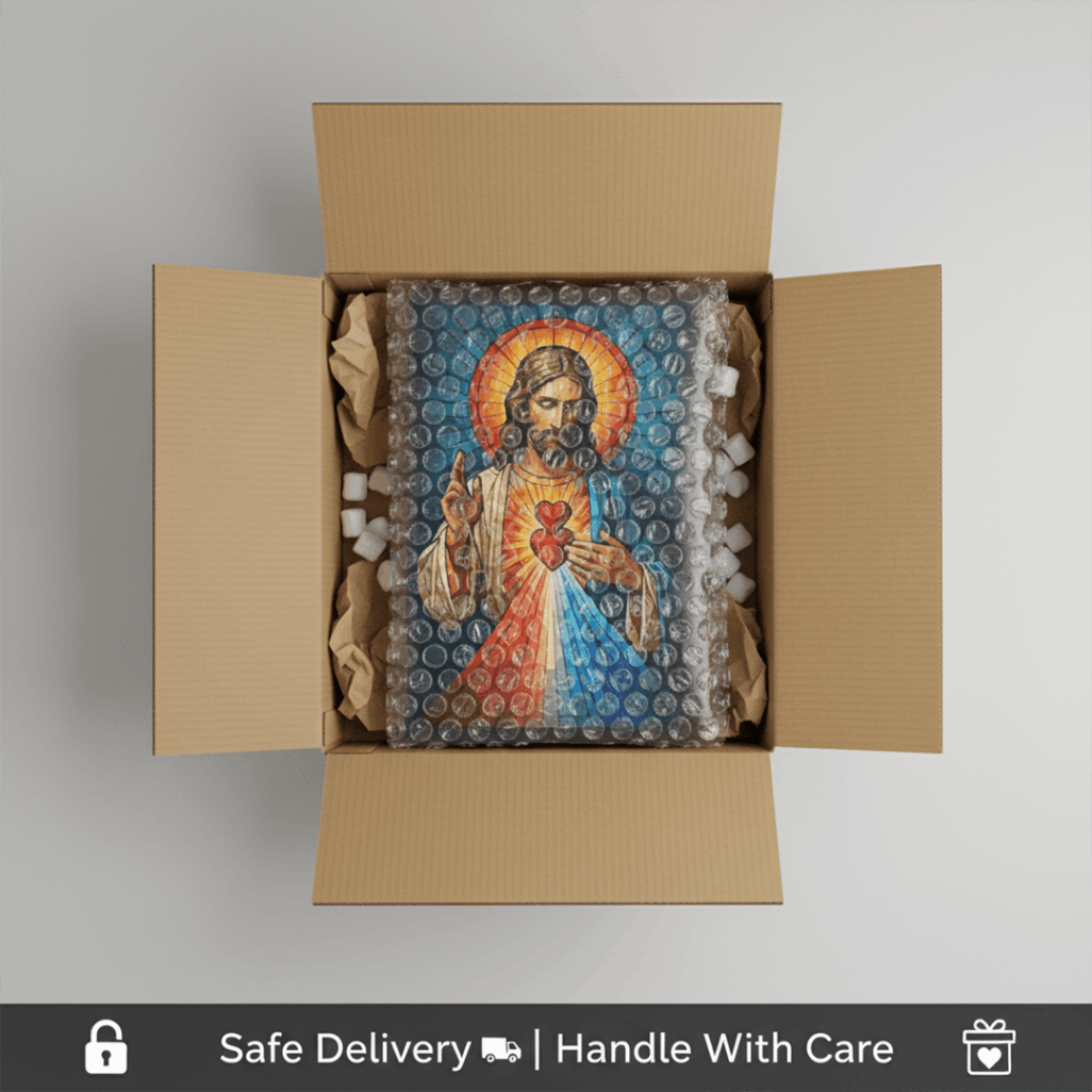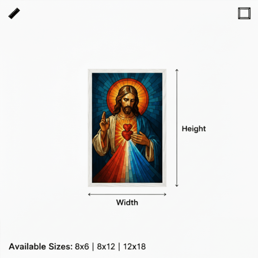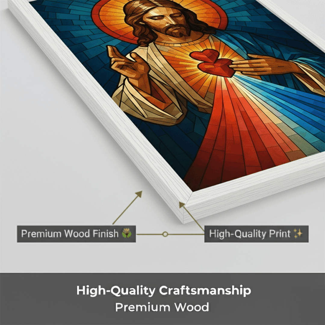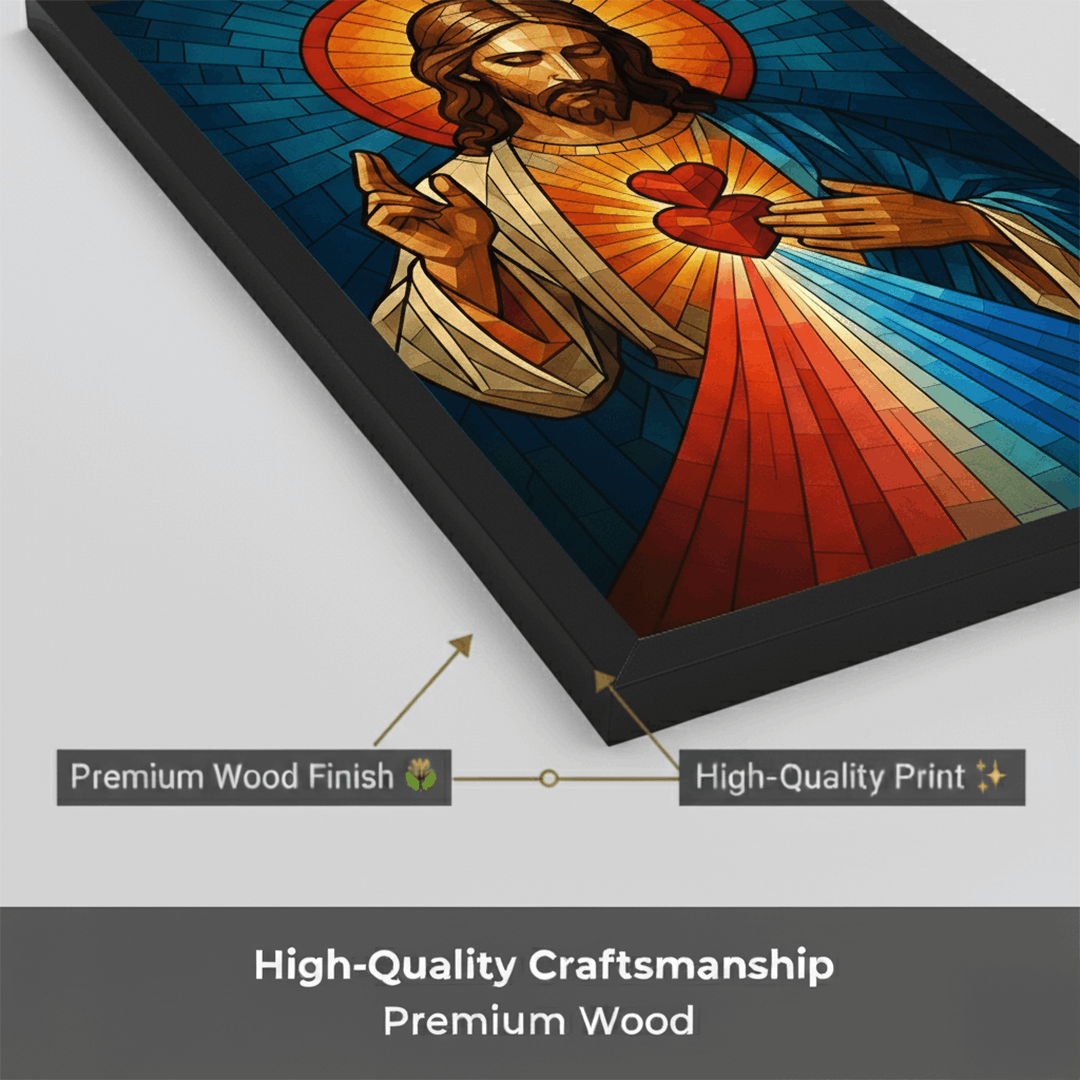 This stunning framed artwork depicts the Divine Mercy of Jesus in a radiant stained-glass style. The design features vivid blue, red, and golden hues symbolizing grace, forgiveness, and divine love. The intricate detailing and luminous color palette bring a sacred elegance that enhances any spiritual or home setting. Printed on premium-quality material and encased in a sleek black frame, this piece beautifully captures both artistry and devotion.