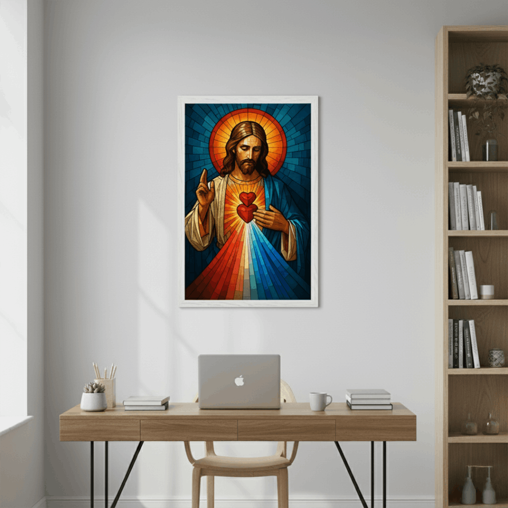 Vibrant stained-glass style framed art of the Divine Mercy of Jesus, radiating grace and divine compassion.