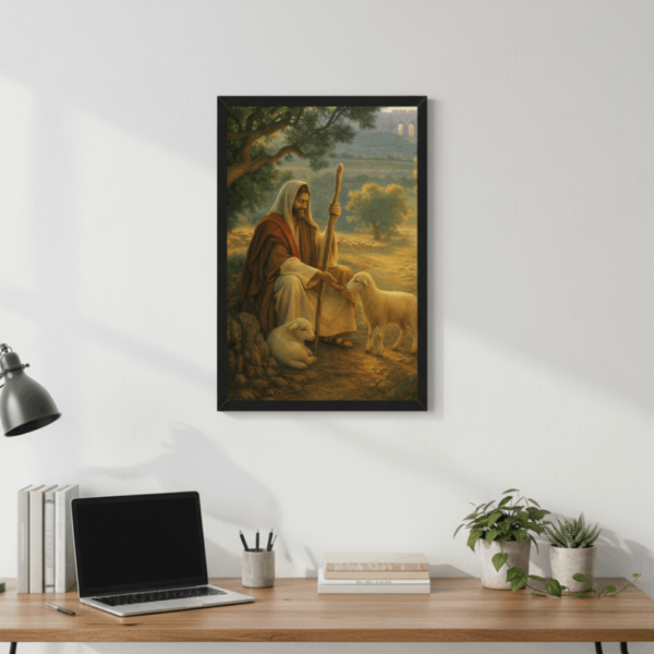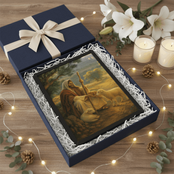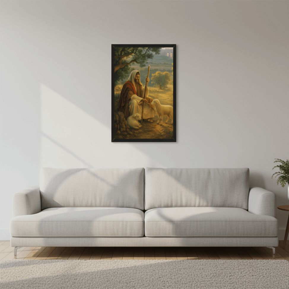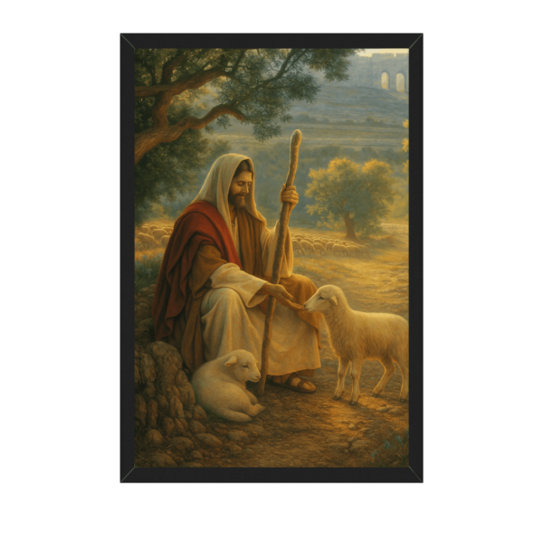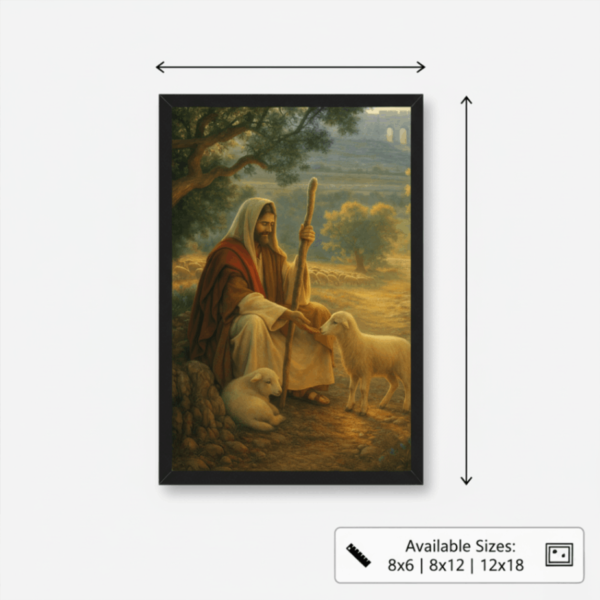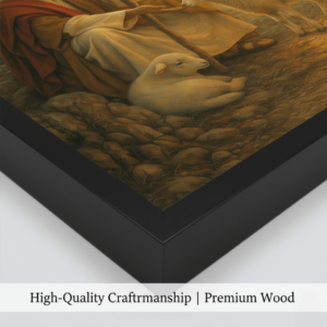 This framed wall art beautifully portrays the image of the Good Shepherd with his flock, symbolizing care, guidance, and peace.