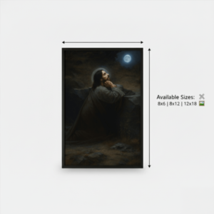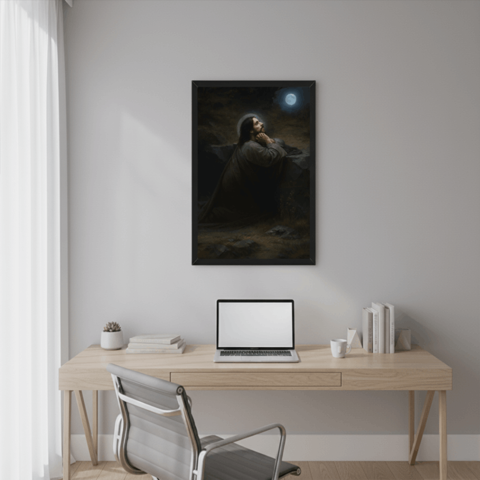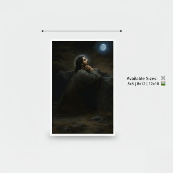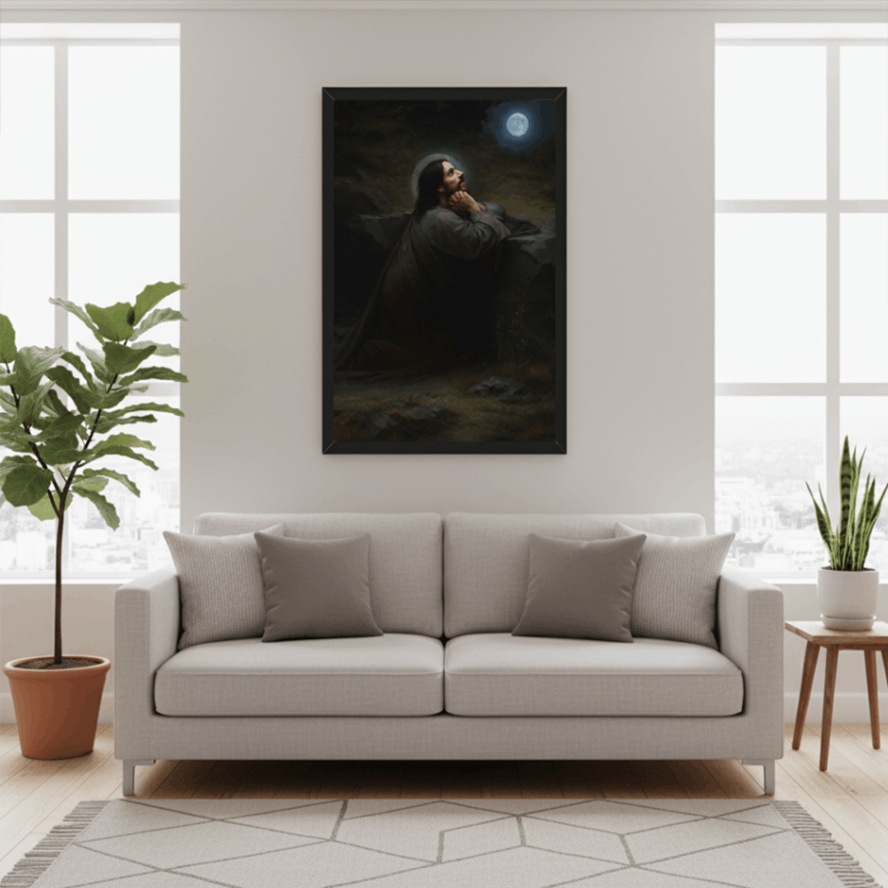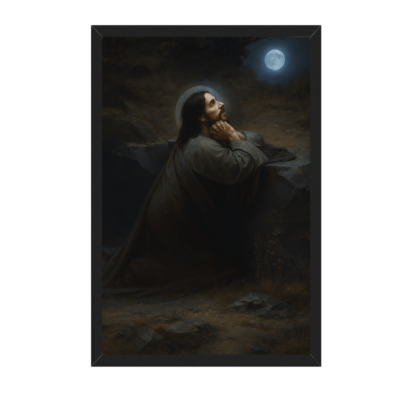 This framed artwork depicts a powerful and serene scene of Jesus praying in the Garden of Gethsemane under the moonlit sky.