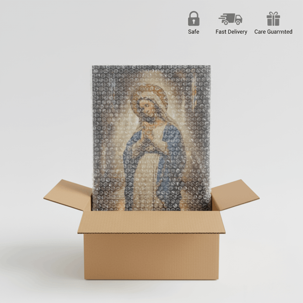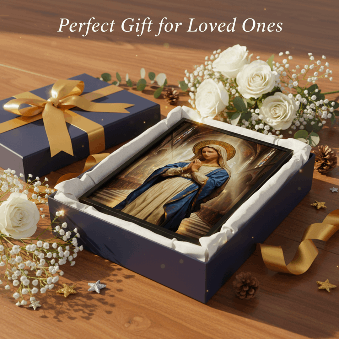 This exquisite framed artwork portrays the Virgin Mary in serene prayer within a softly lit cathedral. The delicate detailing, radiant halo, and flowing blue and white robes symbolize purity, grace, and divine devotion. Printed on high-quality material with rich, lifelike colors, the artwork is enclosed in a sleek black frame that enhances its spiritual beauty. Ideal for prayer rooms, chapels, or home décor, it serves as a timeless expression of faith and reverence.